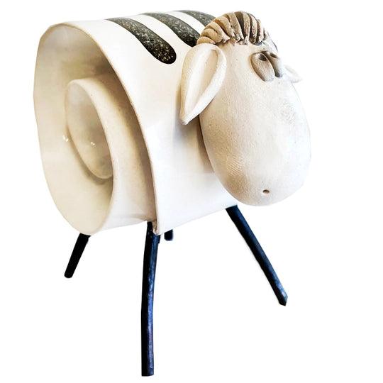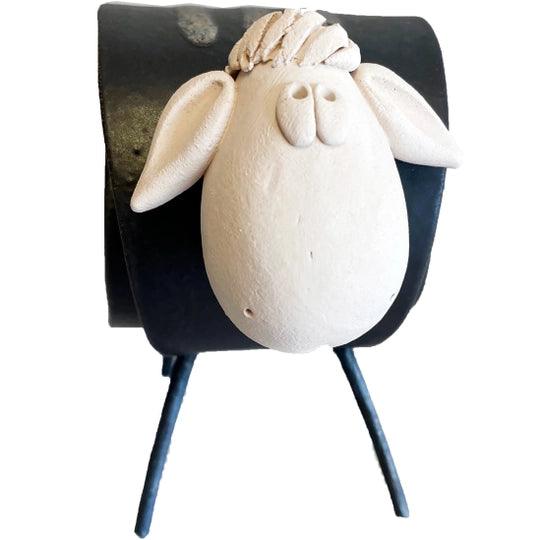 Solid pottery sheep glazed in variety of colours, standing on wire legs.