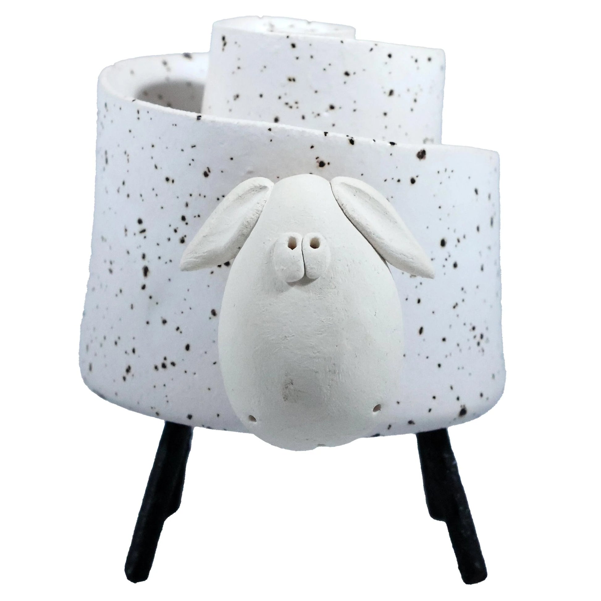 Solid pottery sheep glazed in variety of colours, standing on wire legs.