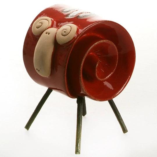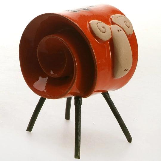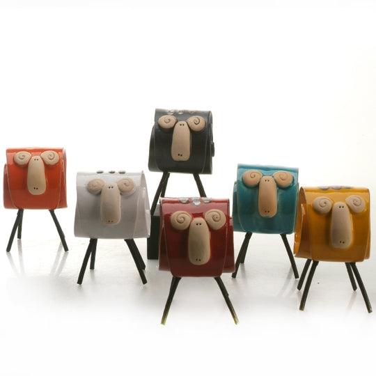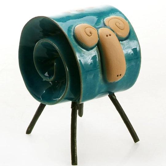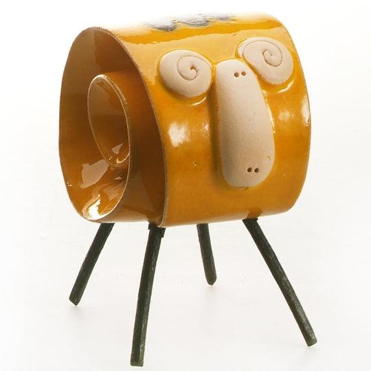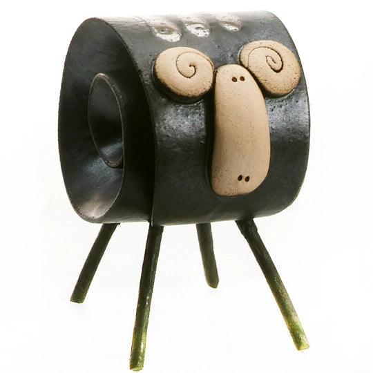 Solid pottery ram glazed in variety of colours, standing on wire legs.
