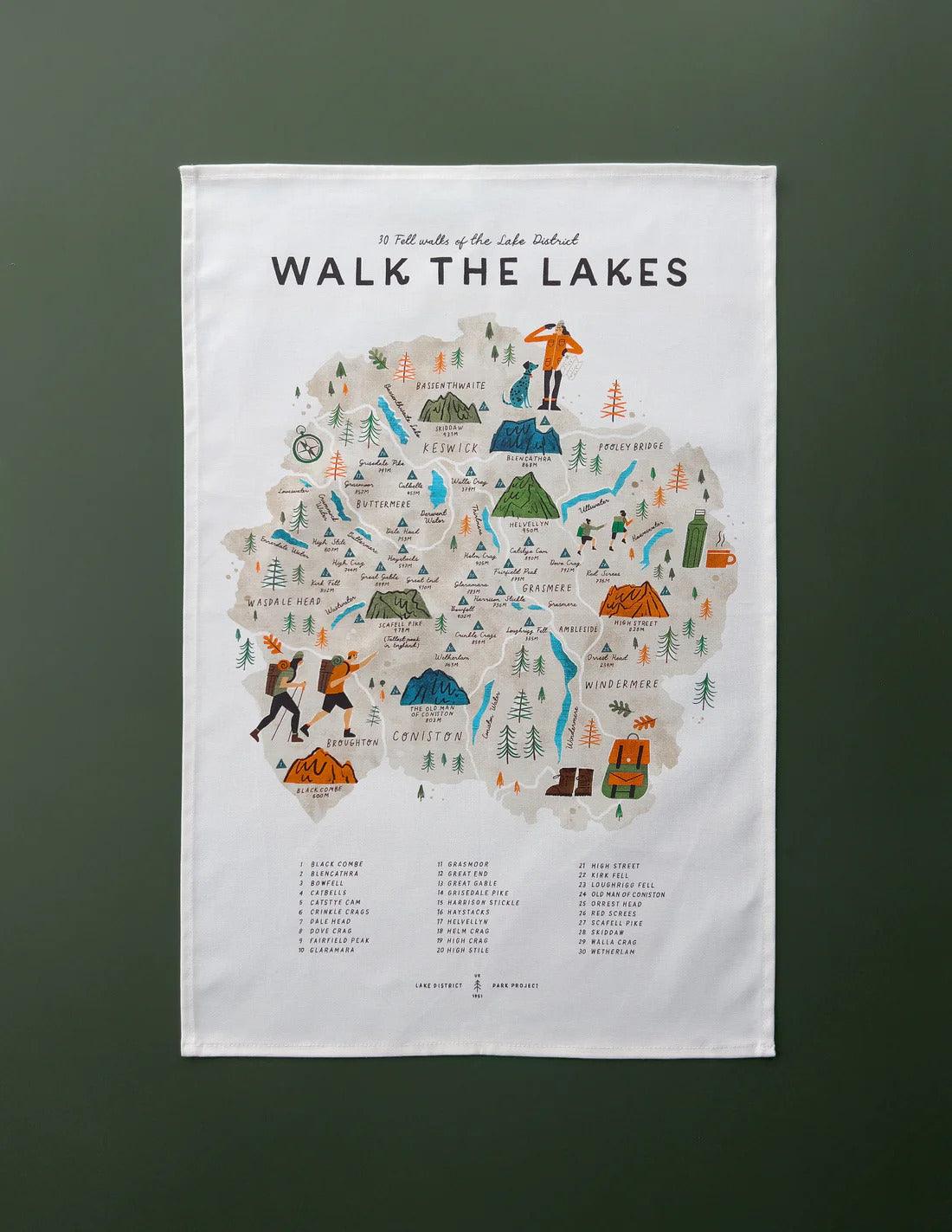 Walk the Lakes Tea Towel - 30 Mountain Walks of the Lake District. Illustrated map by Oldfield Design Co.